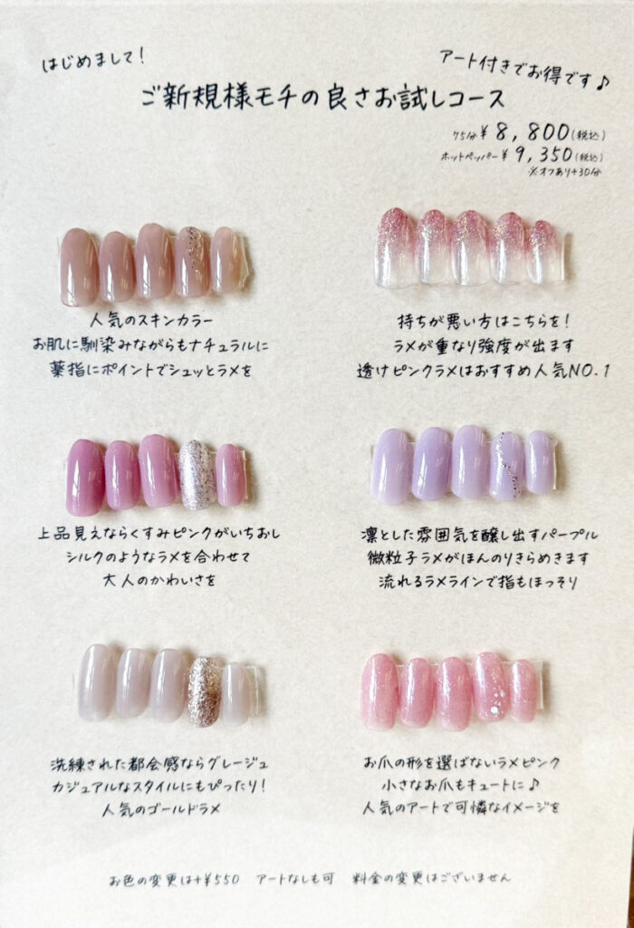 A.一度お爪を拝見させていただいてからお客様に合ったメニューをご提案させていただきます。